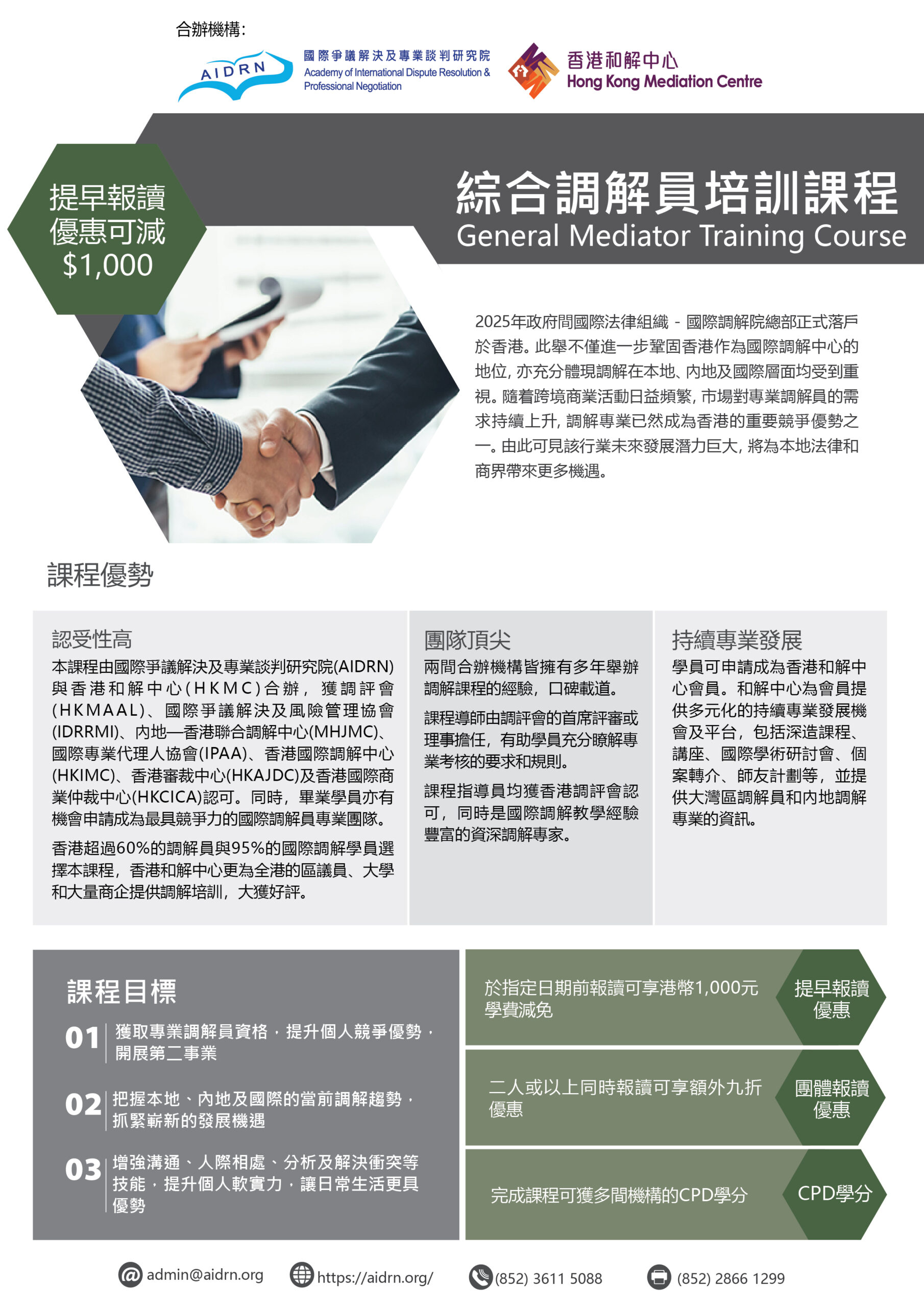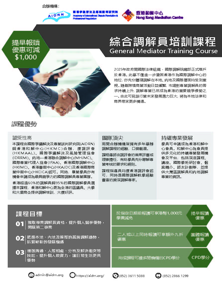 ~ 團體報讀優惠:二人或以上同時報讀本綜合調解員培訓課程,可享額外九折優惠 - 截止報名日期: 2026年2月25日